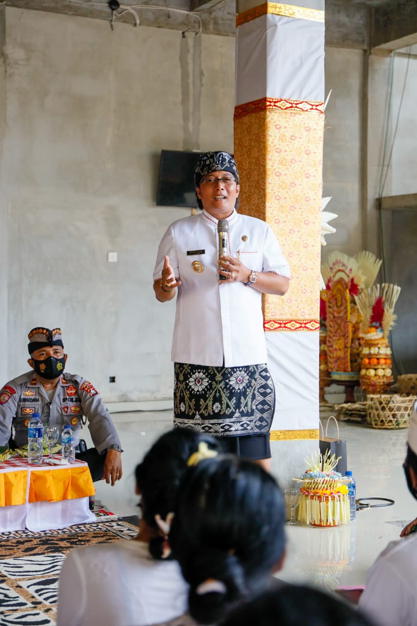 “Kami atas nama Pemkab Badung merasa bangga melihat gotong-royong krama Br. Bedauh sehingga mampu melaksanakan karya memukur seperti ini, terlebih di tengah wabah covid-19. Namun kami ingatkan krama banjar tetap mematuhi protokol kesehatan,” jelas Bupati Giri Prasta saat menghadiri upacara Ngengget Don Bingin lan Ngajum Puspa sebagai rangkaian Karya Memukur di Br. Bedauh, Carangsari, Selasa (15/6). Turut hadir anggota DPRD Provinsi Bali I Nyoman Laka, anggota DPRD Badung Gusti Ayu Agung Inda Trimafo Yuda, Camat Petang I Wayan Darma serta tokoh masyarakat.