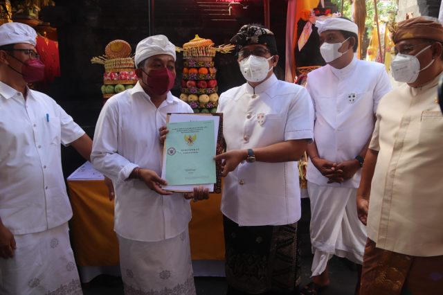 HIBAH TANAH – Bupati Giri Prasta menyerahkan hibah tanah Pemkab Badung serangkaian Pujawali Pura Pengulun Banjar Legian Kaja, Desa Adat Legian, Kelurahan Legian, Kecamatan Kuta, Jumat (17/9).