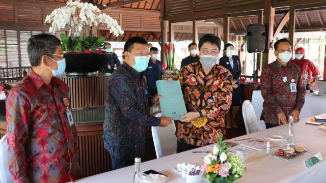 PAPARAN – Sekda Kota Denpasar, AAN Rai Iswara menyerahkan paparan usai menyampaikan laporan dan inovasi dalam mendukung optimalisasi pendapatan daerah kepada Kepala Kordinator Wilayah Kedeputian Bidang Pencegahan KPK RI, Adliansyah Nasution di Hotel Puri Santrian Denpasar, Senin (19/10/2020).