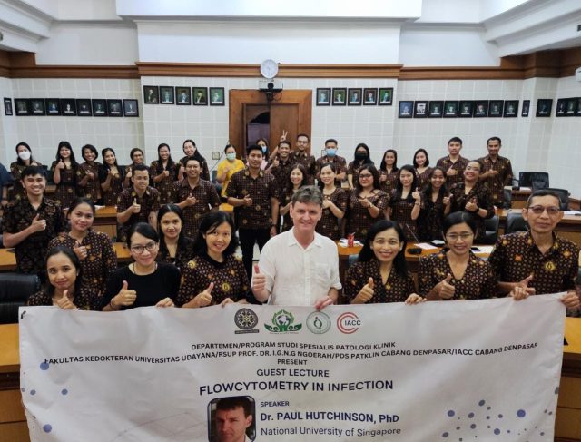 Program Studi Spesialis Patologi Klinik FK Unud menyelenggarakan guest lecture dengan tema Flowcytometry in Infection secara hybrid dengan titik lokasi utama di ruang Prof. dr. IGNG Ngoerah, Gedung FK, Denpasar, Sabtu (18/2/2023). Acara ini menghadirkan dosen tamu dari National University of Singapore, Dr. Paul Hutchinson, Ph.D yang membahas mengenai Flowcytometry Applications in Infectious Disease.
