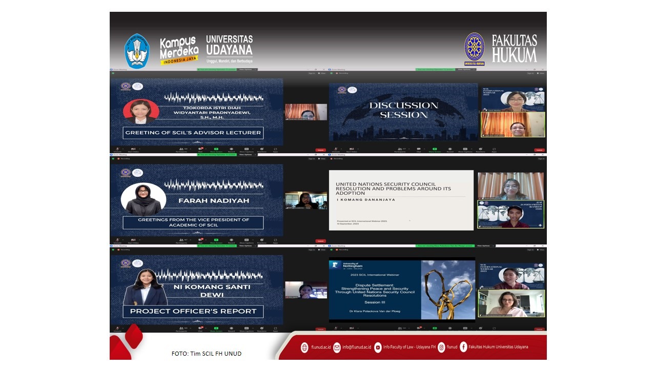 Student Community for International Law (SCIL) Local Chapter (LC) Unud menyelenggarakan kegiatan SCIL Seminar International 2023. Seminar kali ini mengangkat tema “Dispute Settlement: Strengthening Peace and Security through United Nations Security Council Resolutions”. Seminar ini dilaksanakan pada Minggu (10/9/2023) secara daring melalui zoom meeting, dengan jumlah peserta yang mendaftar 383 orang dan menghadirkan 3 narasumber.