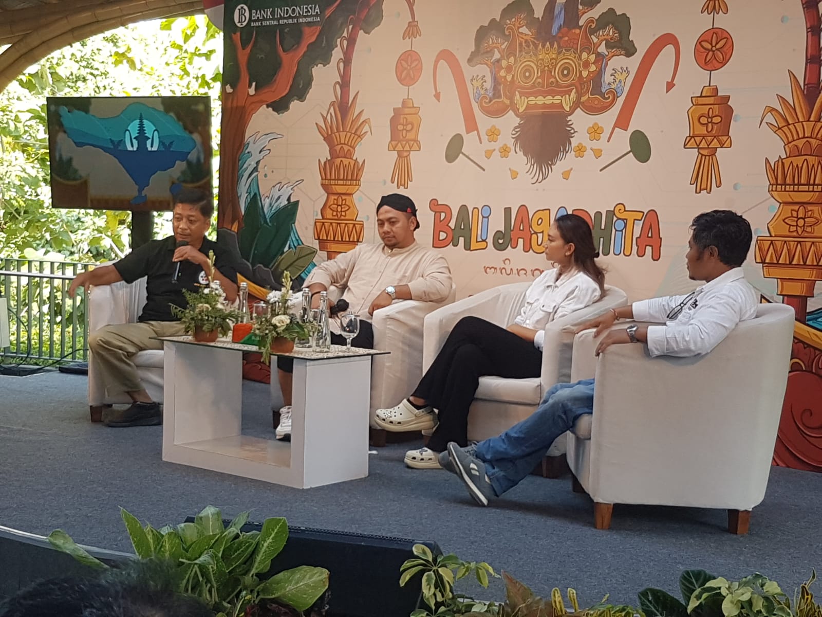 BAHAS KOPI – Talkshow yang membahas kopi dari hulu hingga hilir digelar pada hari ketiga BJCW IV yang digelar BI Bali di Living World Denpasar, Minggu (17/9/2023).