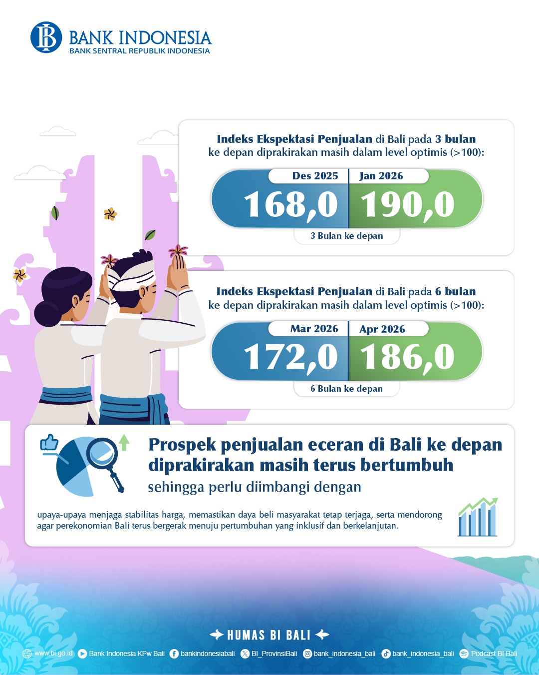 Para responden memperkirakan penjualan dalam 3 hingga 6 bulan mendatang tetap terjaga, tercermin dari IEP Januari 2026 yang mencapai 190 dan April 2026 sebesar 186, keduanya berada di zona optimis (IEP > 100). Meskipun dinamika ekonomi global masih terus membayangi, IEP mencerminkan perekonomian Bali diproyeksikan terus berkembang.