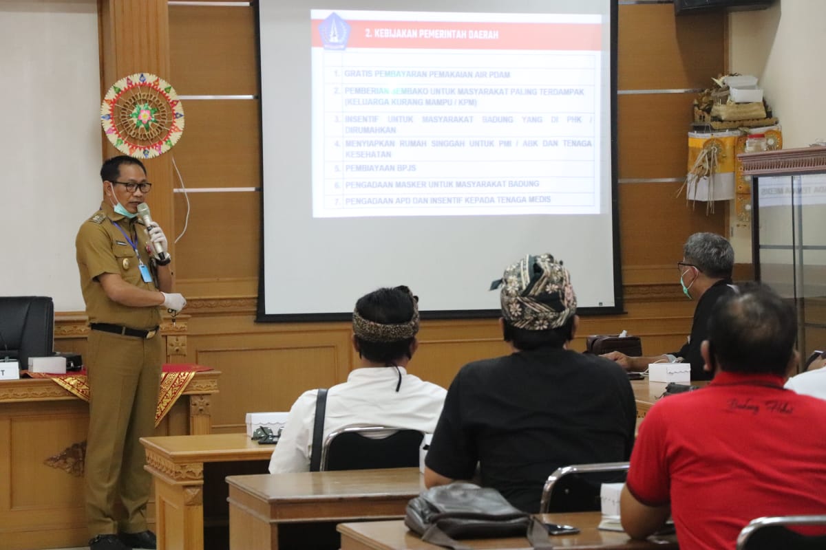 Wabup Suiasa mengatakan, sosialisasi ini dilaksanakan melalui pemaparan yang lebih detail, lebih substantif, lebih teknis dan lebih operasional tentang kebijakan-kebijakan khusus dari Pemerintah Kabupaten Badung dalam rangka penanganan covid-19. Dikatakan, Bupati sudah menyampaikan kepada publik melalui media massa, terkait adanya kebijakan dari Pemkab Badung yang bersumber dari APBD. Namun karena penanganan covid-19 ini merupakan penanganan bersama dari semua tingkatan pemerintah, mulai dari pemerintah pusat yang merupakan pemangku yang pertama, penanganan pemerintah provinsi dan kabupaten, bahkan sampai penanganan yang ditangani pemerintah desa.