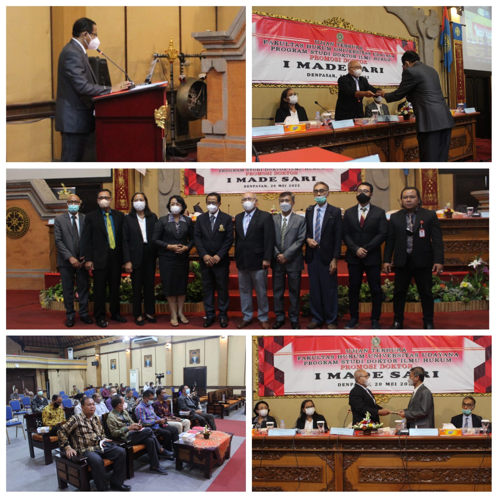 Ujian Terbuka Promosi Doktor dengan Promovendus I Made Sari diselenggarakan secara hybrid pada 20 Mei 2022 di Aula Fakultas Hukum Universitas Udayana dengan disertasi berjudul “Konstruksi Pengaturan Kewenangan Jaminan Sita Komisi Pengawasan Persaingan Usaha dalam Perspektif Perbandingan ”. Ujian Terbuka Promosi Doktor yang berlangsung kurang lebih selama 3 jam dipimpin oleh Koprodi Doktor Ilmu Hukum Fakultas Hukum Universitas Udayana, Prof. Dr. I Putu Sudarma Sumadi, SH.,M.S; Prof. Dr. Ni Ketut Supasti Dharmawan., SH.,M.Hum.,LLM selaku Promotor; Dr. Marwanto, SH.,M.H selaku Kopromotor; Dr. I Made Sarjana, SH.,MH selaku Kopromotor II, dan menghadirkan penguji eksternal Prof. Dr. Irwansyah, S.H., M.H dari FH Universitas Hasanuddin serta 3 penguji/penyanggah lainnya.