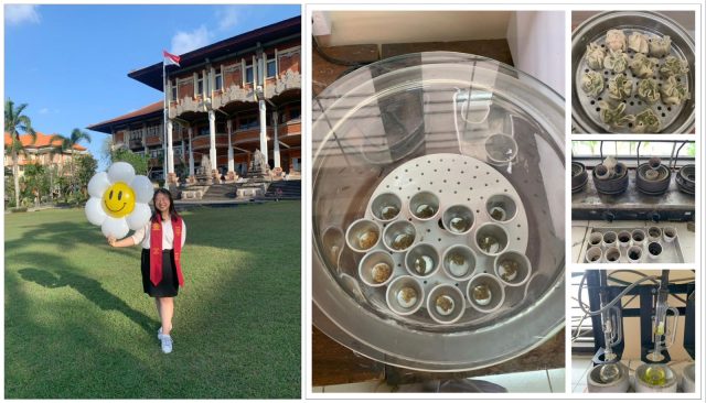 Michelle Anabelle Christantio atau yang sering disapa Mibel telah meraih gelar Sarjana Teknologi Pangan (STP) dari Program Studi Teknologi Pangan, Fakultas Teknologi Pertanian, Universitas Udayana dan resmi diwisuda pada bulan lalu. Gelar tersebut diraih oleh Mibel melalui penelitian dengan judul ”Karakteristik Fisik, Kimia, dan Sensoris Siomay Ayam dengan Penambahan Bayam (Amaranthus tricolor L.)” di bawah bimbingan Ni Luh Ari Yusasrini, STP, MP dan Luh Putu Trisna Darmayanti, S.Hut, MP.