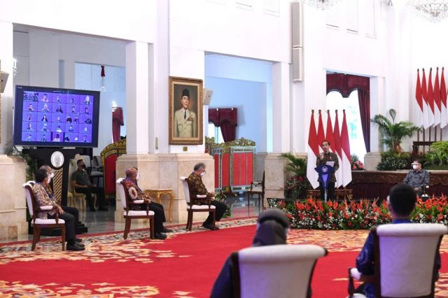 ARAHAN – Presiden Jokowi memberikan arahan dalam rakernas Kementerian Perdagangan 2021, Kamis (4/3).