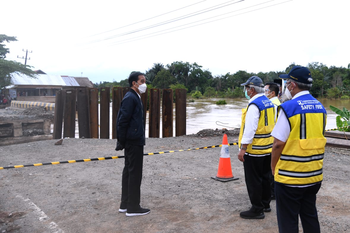“Saya ingin memastikan ke lapangan, yang pertama mengenai kerusakan infrastruktur yang memang terjadi. Ada beberapa jembatan yang runtuh, seperti kita lihat di belakang ini. Tadi saya sudah minta ke Menteri PU agar dalam 3-4 hari ini bisa diselesaikan sehingga mobilitas distribusi barang tidak terganggu,” ujar Presiden saat meninjau Jembatan Mataraman di Kecamatan Astambul, Kabupaten Banjar, pada Senin, 18 Januari 2021.