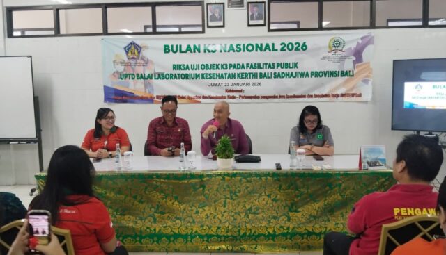 Serangkaian peringatan Bulan Keselamatan dan Kesehatan Kerja (K3), Dinas Ketenagakerjaan dan Energi Sumber Daya Mineral Provinsi Bali melaksanakan pemeriksaan dan pengujian (riksa uji) objek K3 di UPTD Balai Laboratorium Kesehatan Kerthi Bali Sadhajiwa. Informasi tersebut disampaikan Kepala Dinas Ketenagakerjaan dan ESDM Provinsi Bali, Ida Bagus Setiawan, dalam siaran persnya, Jumat (23/1/2026).