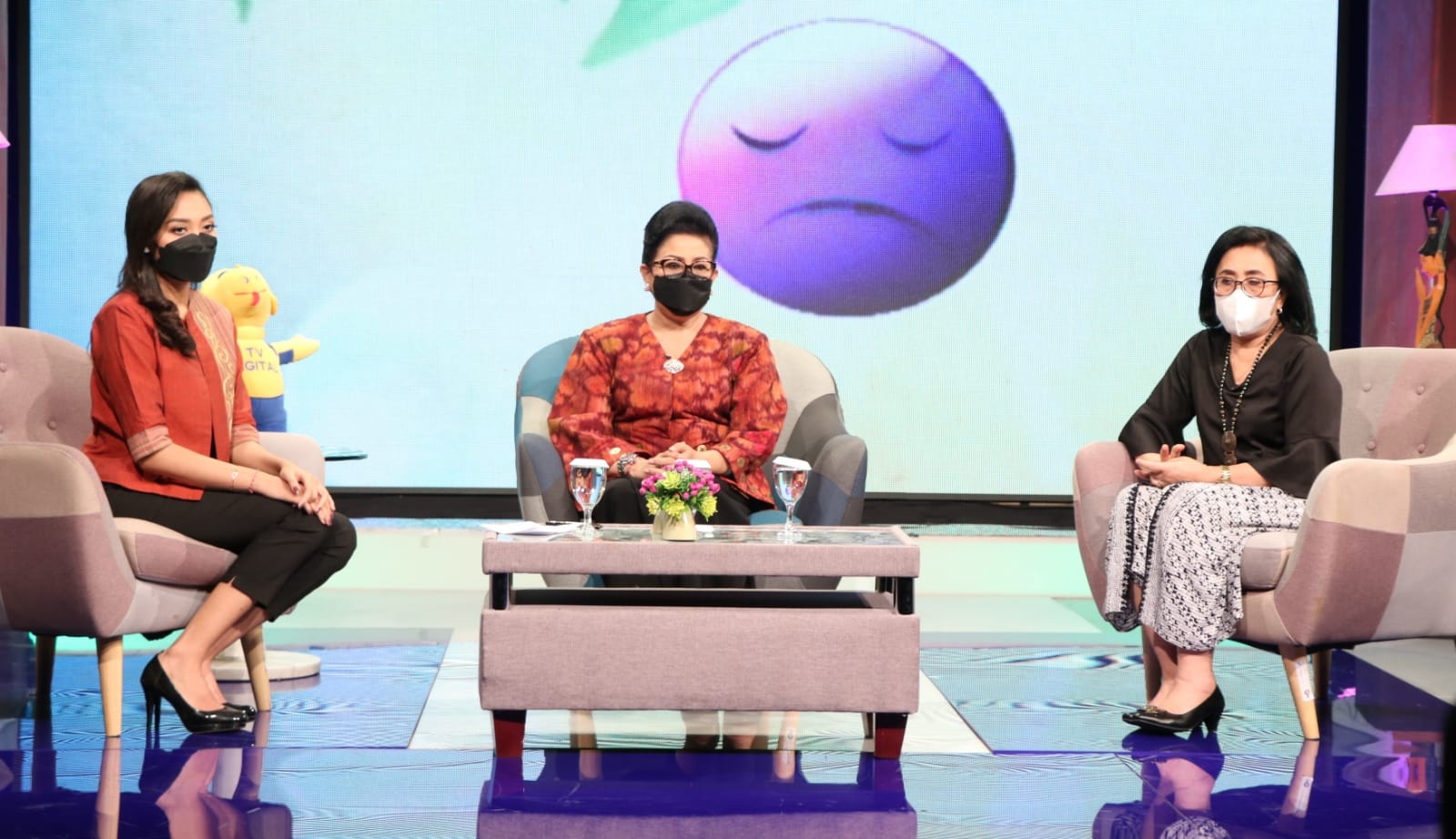 BAHTERA – Ketua TP PKK Bali Ny. Putri Koster bersama Sayu Sutrisna Dewi pada acara Dialog Bahtera di TVRI Bali, Rabu (24/11/2021).