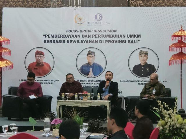 FGD ini menghadirkan anggota Komisi XI DPR RI, I Gusti Agung Rai Wirajaya, SE, MM, Kepala Perwakilan Bank Indonesia Provinsi Bali, R. Erwin Soeriadimadja, dan akademisi Fakultas Ekonomi dan Bisnis Universitas Udayana, Dr. Made Dwi Setyadhi Mustika, SE, M.Si. Masalah akses permodalan bagi UMKM pada dasarnya telah mendapat solusi dari berbagai kebijakan pemerintah seperti adanya Program UMKM Binaan Bank Indonesia. Ditambah lagi adanya kebijakan pemerintah dalam mengupayakan digitalisasi UMKM dengan menargetkan 40 juta UMKM terdigitalisasi pada tahun 2024.