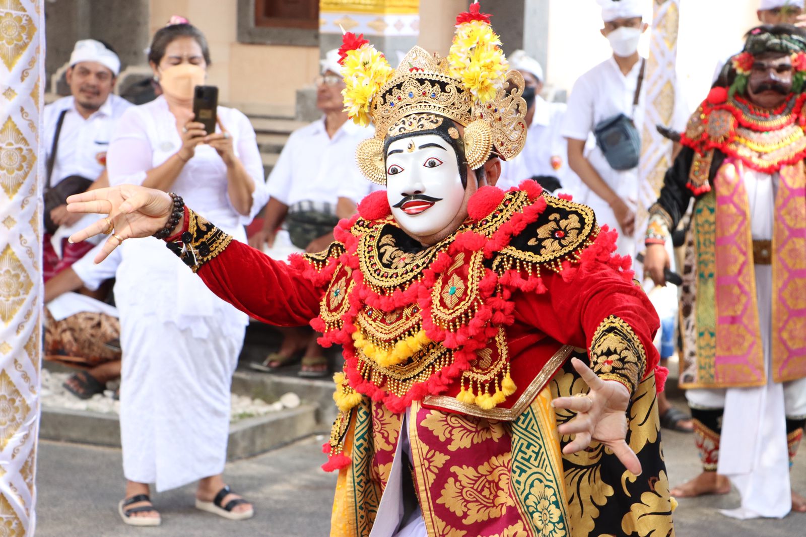 Wali Kota Denpasar I Gusti Ngurah Jaya Negara Ngayah Mesolah Topeng serangkaian Upacara Karya Memungkah, Ngenteg Linggih Lan Pedudusan Alit di Merajan Keluarga Besar Arya Wang Bang Pinatih (AWBP) Jalan Arjuna, Banjar Tampakgangsul, Desa Dangin Puri Kauh, Kecamatan Denpasar Utara, Rabu (27/7) sore. Dalam kesempatan tersebut, Walikota Jaya Negara Ngayah Nyolahang Topeng Dalem Arsa Wijaya.