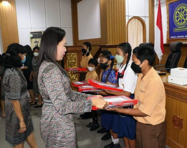 Dharma Wanita Persatuan (DWP) Universitas Udayana menyerahkan dana bantuan beasiswa pada 24 anak pada Jumat (16/9) di Ruang Bangsa, Rektorat Bukit Jimbaran. Pemberian beasiswa ini merupakan program kerja rutin DWP Unud yang dilaksanakan setiap tahun pada September menjelang Dies Natalis Unud.
