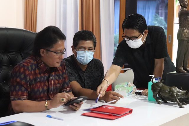 RAKOR – Bupati Giri Prasta saat mengikuti rakor dengan Kemensos secara virtual dari RJ Bupati Puspem Badung, Sabtu (17/7/2021).