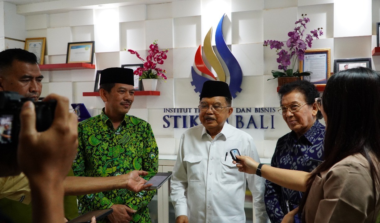 KETERANGAN PERS – Jusuf Kalla didamping Dr. Dadang Herman dan Prof. Dr. I Made Bandem, MA saat memberi keterangan pers di kampus ITB STIKOM Bali, Jumat (19/09/2025).