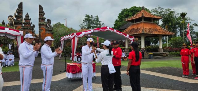 API OBOR – Kontingen Kabupaten Badung menerima Api Obor Pekan Olahraga Provinsi (Porprov) Bali XVI 2025 yang diserahkan oleh kontingen Kabupaten Tabanan, Senin (8/9) di Puspem Badung.