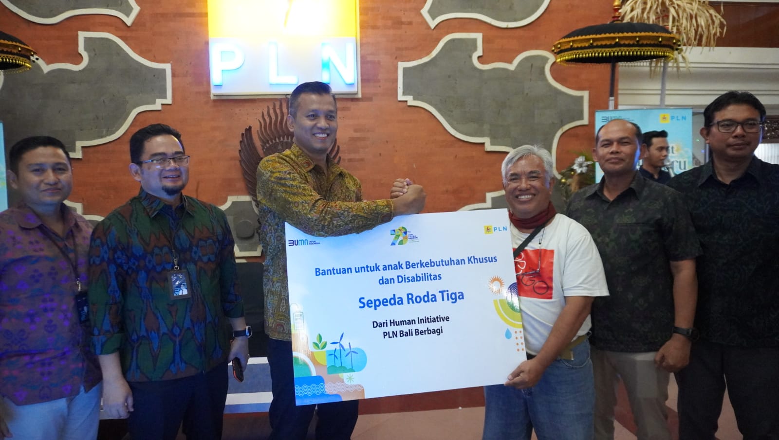 SEPEDA RODA TIGA – General Manager PT PLN (Persero) UID Bali Eric Rossi Priyo Nugroho menyerahkan secara simbolis sumbangan sepeda roda tiga kepada Perintis Sahabat Yog Colony community Ketut Yogaster Susenopathy.