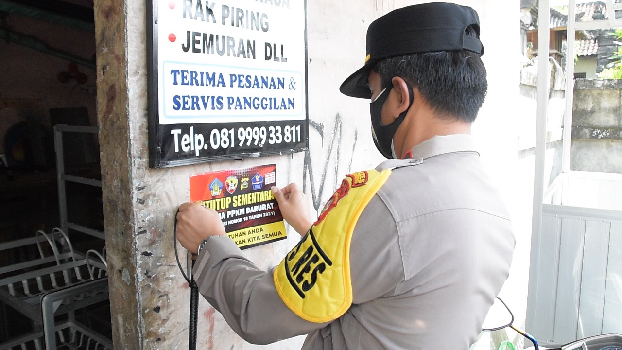 Kapolres Badung, AKBP Roby Septiadi, SIK menutup sementara sejumlah usaha non-esensial di Banjar Denkayu Baleran, Desa Werdi Bhuana, Kecamatan Mengwi, Badung, Rabu (14/7) pagi. Penutupan itu ditandai dengan pemasangan stiker larangan buka hingga sampai batas akhir Pemberlakukan Pembatasan Kegiatan Masyarakat (PPKM) Darurat 20 Juli ini. Pemilik usaha yang ditutup diberi bantuan sembako.
