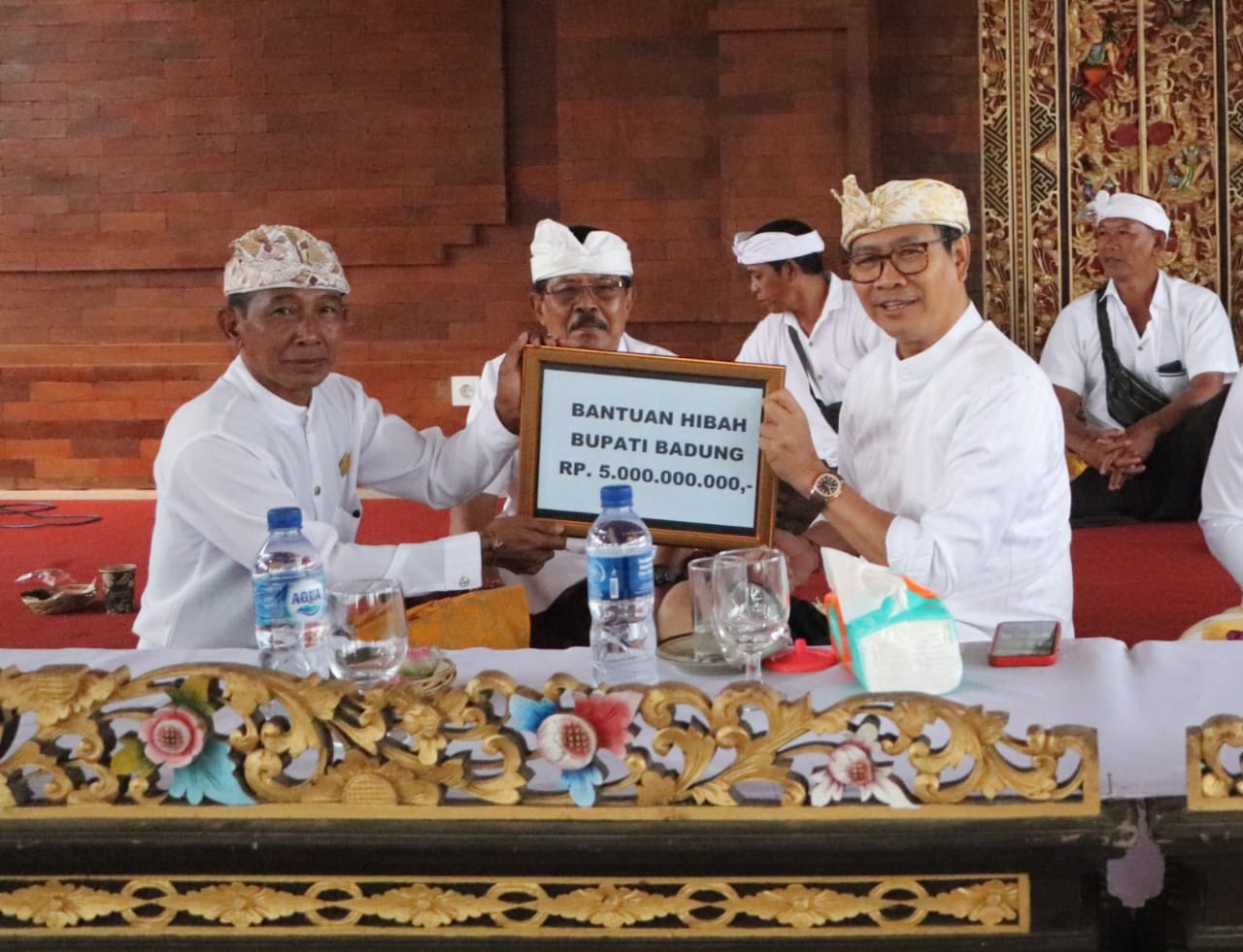 Sebagai bentuk dukungan dan komitmen pemerintah, Wabup menyerahkan secara simbolis bantuan dana hibah APBD Perubahan tahun 2023 Rp 5 miliar yang diterima oleh Bendesa Adat Pelaga.