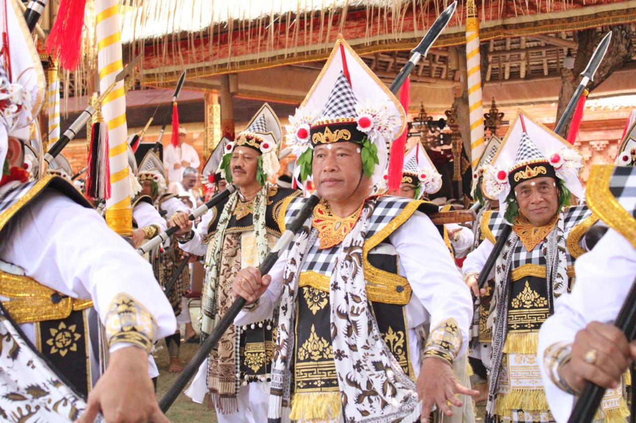 BARIS GEDE – Sekda Kota Denpasar Ida Bagus Alit Wiradana ngayah menarikan Tari Baris Gede pada puncak Karya yang dilaksanakan bertepatan dengan Purnama Sasih Kalima, Sabtu (16/11).