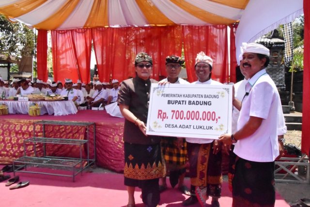 Kepada masyarakat maupun desa adat yang lain dapat melaksanakan yadnya seperi di Lukluk ini, dan Pemkab Badung akan siap membantu meringankan beban masyarakat. “Dana yang semestinya dikeluarkan untuk urunan, bisa dikelola di dalam rumah tangga, sehingga ekonomi keluarga menjadi meningkat dan astungkara kemiskinan akan menurun,” tambahnya. Sebagai wujud bakti kepada masyarakat Lukluk, Bupati menyerakan dana upakara sebesar Rp700 juta.