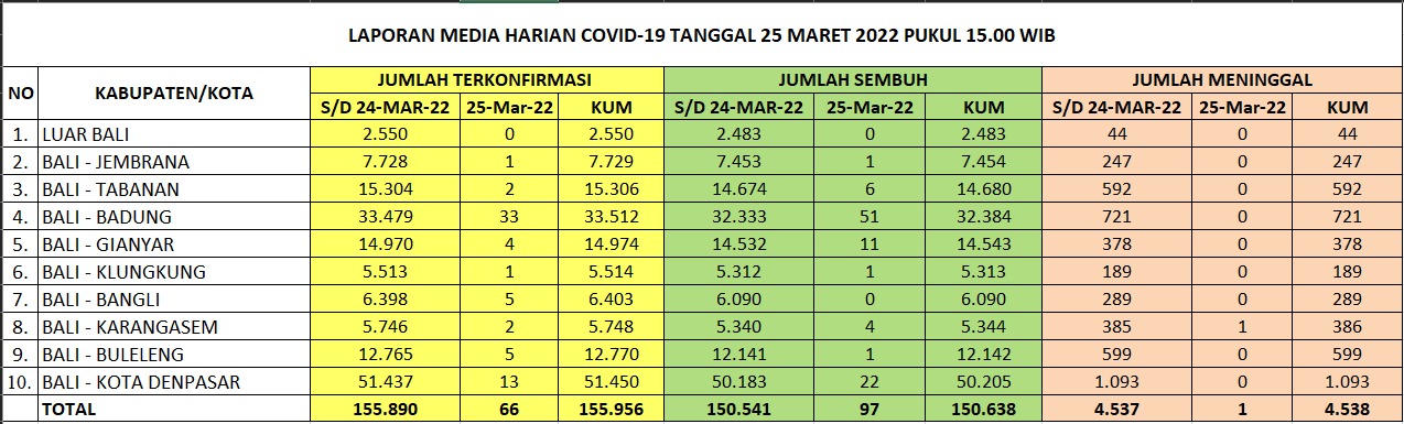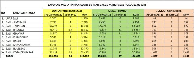 Sekretaris Satgas Penanggulangan Covid-19 Provinsi Bali I Made Rentin menyampaikan perkembangan covid-19 di Bali. Pada Jumat, 25 Maret 2022, terjadi pertambahan kasus terkonfirmasi positif 66 orang sehingga menjadi 155.956 orang, pasien sembuh bertambah 97 orang sehingga menjadi 150.638 orang, dan kasus meninggal dunia 1 orang sehingga menjadi 4.538 orang.