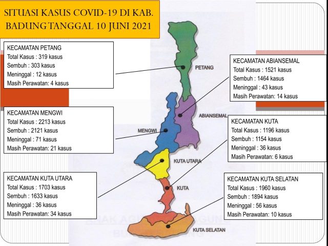 Pada Kamis (10/6) hari ini, ada tambahan 20 kasus positif/konfirmasi sehingga total kumulatif kasus positif/konfirmasi covid-19 di Kabupaten Badung kini menjadi 8.912 orang. Hal ini diungkapkan Koordinator Kehumasan GTPP Covid-19 Badung GN Jaya Saputra.