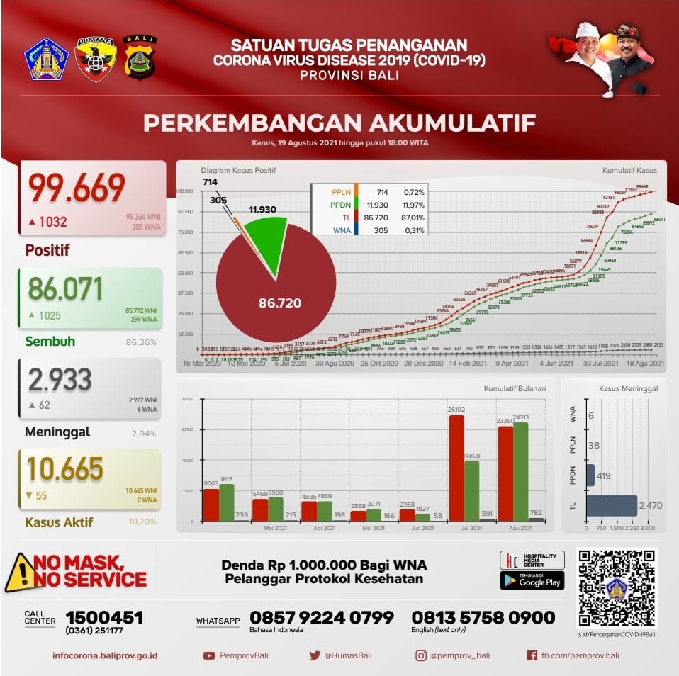 Pertambahan kasus covid-19 pada Kamis (19/8/2021) hari ini sebagai berikut, terkonfirmasi 1.032 orang (839 orang melalui transmisi lokal, 189 PPDN dan 4 PPLN), sembuh 1.025 orang dan 62 pasien meninggal dunia.