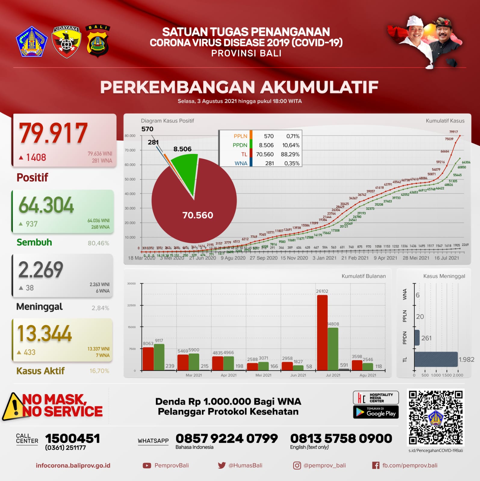 Jumlah kasus secara kumulatif sebagai berikut, terkonfirmasi 79.917 orang, sembuh 64.304 orang (80,46%), dan  meninggal dunia 2.269 orang (2,84%). Kasus aktif per hari ini menjadi 13.344 orang (16,70%).