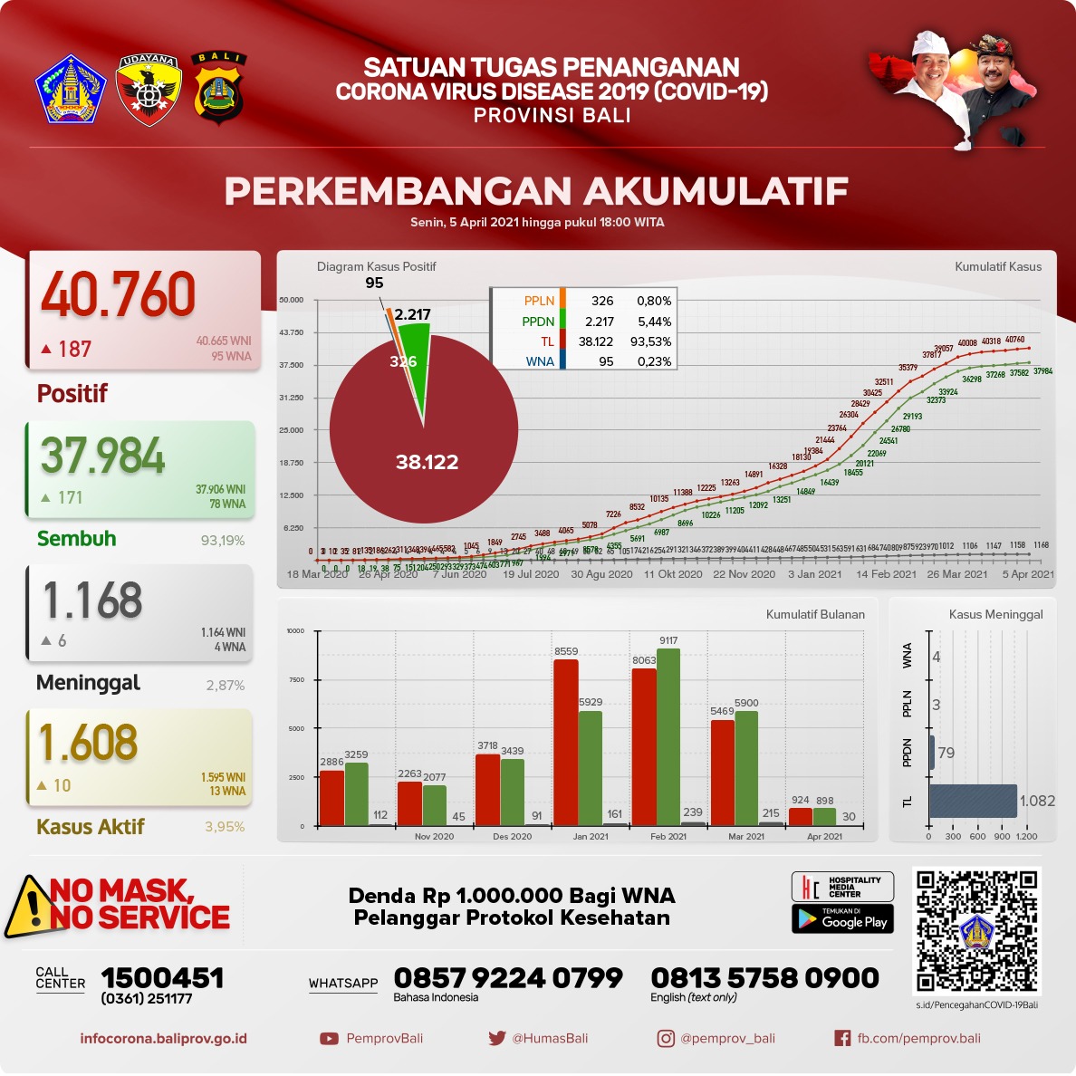 Pertambahan kasus pada Senin (5/4) hari ini yakni terkonfirmasi 187 orang (169 orang melalui transmisi lokal, 17 PPDN dan 1 PPLN), sembuh 171 orang, dan 6 orang meninggal dunia.