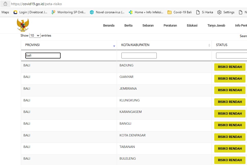 Delapan kabupaten dan satu kota di Bali masuk zone kuning dengan risiko rendah. Kesembilan kabupaten kota tersebut adalah Kabupaten Badung, Gianyar, Klungkung, Bangli, Tabanan, Kabupaten Jembrana, Karangasem, Buleleng, dan Kota Denpasar. (sar/hmbal)