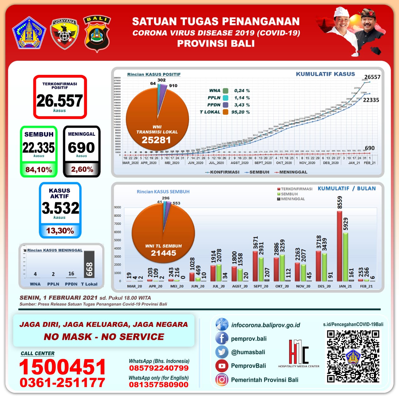 Perkembangan pandemi covid-19 di Provinsi Bali per Minggu (1/2) hari ini mencatat pertambahan kasus terkonfirmasi 253 orang (233 orang melalui transmisi lokal dan 20 PPDN), sembuh 266 orang, dan 6 orang meninggal dunia.