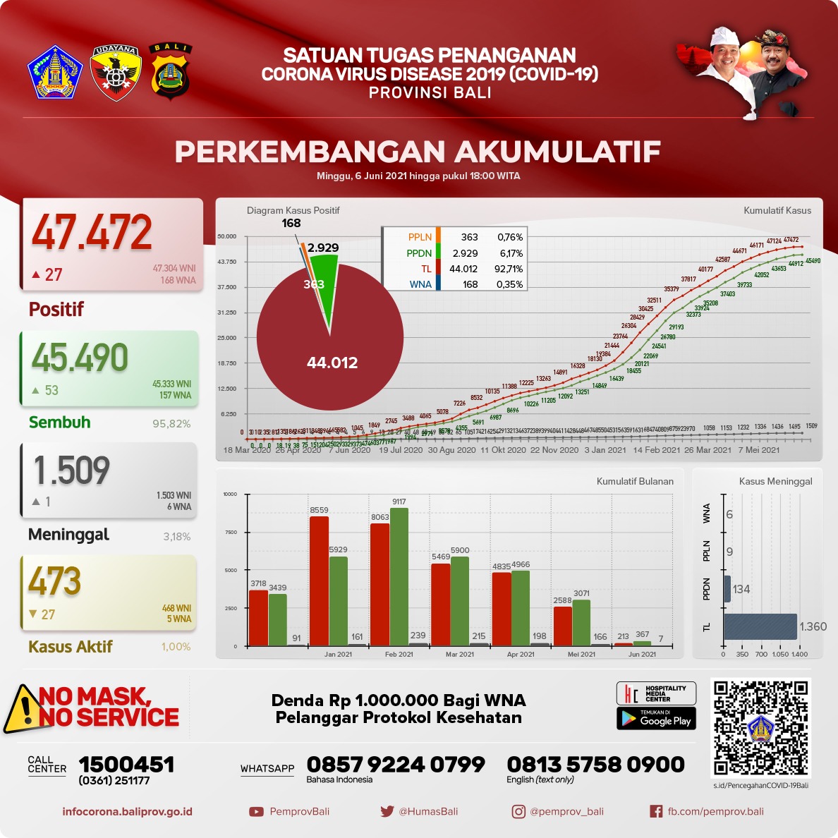 sembuh 45.490 orang (95,82%), dan meninggal dunia 1.509 orang (3,18%). Kasus aktif per hari ini menjadi 473 orang (1,00%).