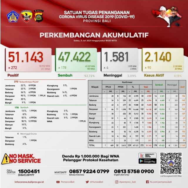 Jumlah kasus secara kumulatif sebagai berikut yakni terkonfirmasi 51.143 orang, sembuh 47.422 orang (92,72%), dan meninggal dunia 1.581 orang (3,09%). Kasus aktif per hari ini menjadi 2.140 orang (4,18%).