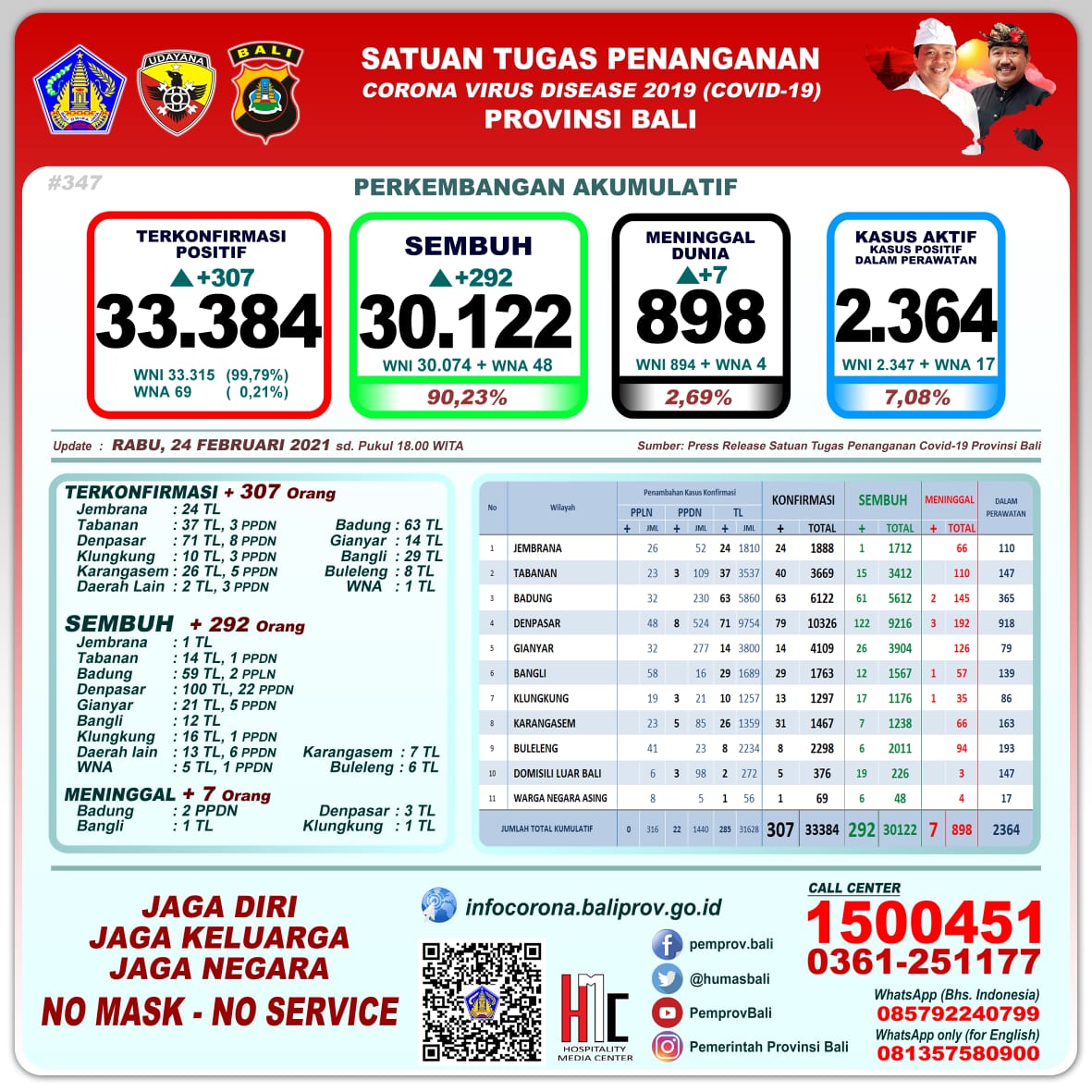 Perkembangan pandemi covid-19 di Provinsi Bali per Rabu (24/2), hari ini mencatat pertambahan kasus terkonfirmasi 307 orang (285 orang melalui transmisi lokal dan 22 PPDN), sembuh 292 orang, dan 7 orang meninggal dunia.