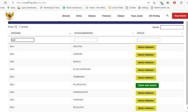 Tujuh kabupaten dan satu kota di Bali masuk zone kuning dengan risiko rendah dan satu kabupaten masuk zone hijau. Kesembilan kabupaten kota tersebut adalah Kabupaten Badung, Gianyar, Klungkung (hijau), Bangli, Tabanan, Kabupaten Jembrana, Karangasem, Buleleng, dan Kota Denpasar. (sar/hmbal)