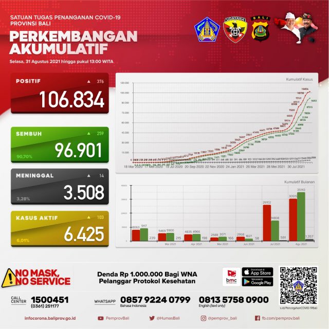 Pertambahan kasus covid-19 pada Selasa (31/8) hari ini sebagai berikut, terkonfirmasi 376 orang, sembuh 259 orang dan 14 pasien meninggal dunia.