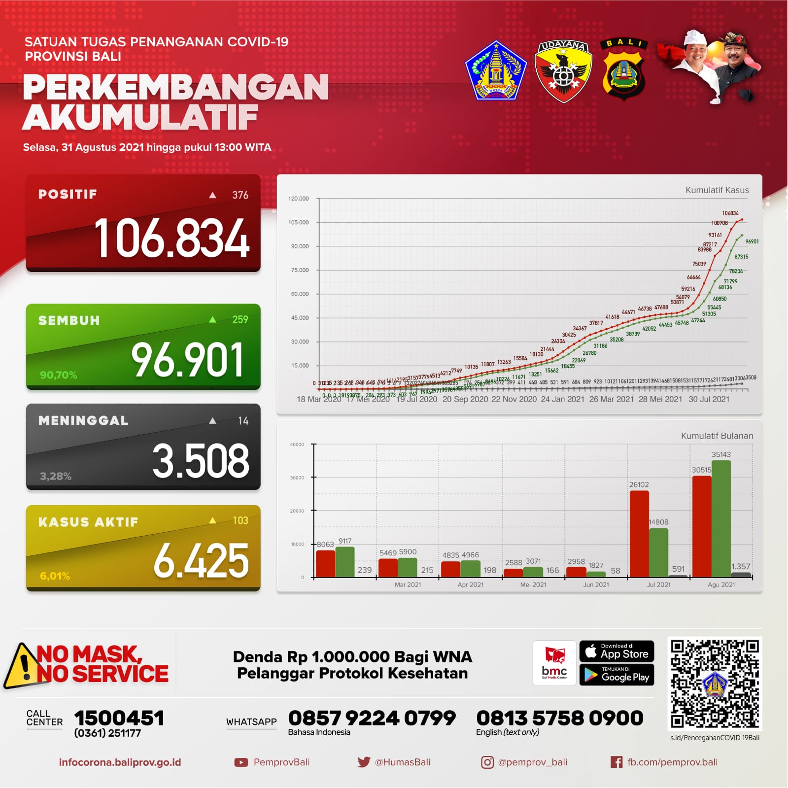 Jumlah kasus secara kumulatif sebagai berikut, terkonfirmasi 106.834 orang, sembuh 96.901 orang (90,70%), dan meninggal dunia 3.508 orang (3,28%). Kasus aktif per hari ini menjadi 6.425 orang (6,01%).