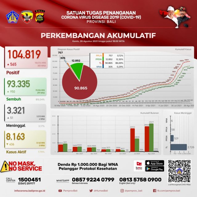 Pertambahan kasus covid-19 pada Kamis (26/8/2021) hari ini sebagai berikut, terkonfirmasi 565 orang (455 orang melalui transmisi lokal, 102 PPDN dan 8 PPLN), sembuh 950 orang dan 51 pasien meninggal dunia.