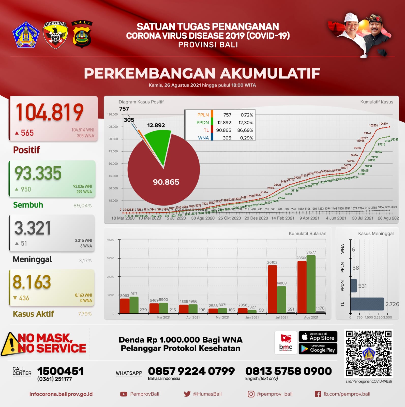 Jumlah kasus secara kumulatif sebagai berikut, terkonfirmasi 104.819 orang, sembuh 93.335 orang (89,04%), dan meninggal dunia 3.321 orang (3,17%). Kasus aktif per hari ini menjadi 8.163 orang (7,79%).
