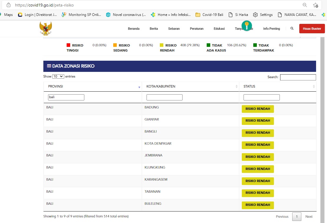 Delapan kabupaten dan satu kota di Bali masuk zone kuning dengan risiko rendah. Kesembilan kabupaten kota tersebut adalah Kabupaten Badung, Gianyar, Klungkung, Bangli, Tabanan, Kabupaten Jembrana, Karangasem, Buleleng, dan Kota Denpasar. (sar/hmbal)