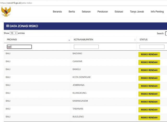 Delapan kabupaten dan satu kota di Bali masuk zone kuning dengan risiko rendah. Kesembilan kabupaten kota tersebut adalah Kabupaten Badung, Gianyar, Klungkung, Bangli, Tabanan, Kabupaten Jembrana, Karangasem, Buleleng, dan Kota Denpasar. (sar/hmbal)