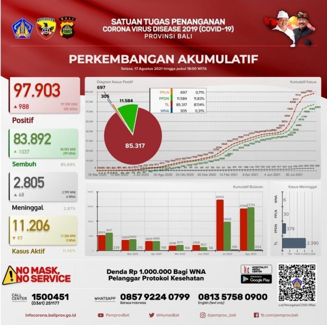 Pertambahan kasus covid-19 pada Selasa (17/8/2021) hari ini sebagai berikut, terkonfirmasi 988 orang (820 orang melalui transmisi lokal, 159 PPDN dan 9 PPLN), sembuh 1.037 orang dan 48 pasien meninggal dunia.