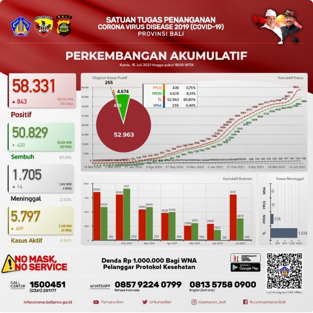 Pertambahan kasus covid-19 pada Kamis (15/7/2021) hari ini sebagai berikut, terkonfirmasi 843 orang (706 orang melalui transmisi lokal, 136 PPDN dan 1 PPLN), sembuh 420 orang dan 14 pasien meninggal dunia.
