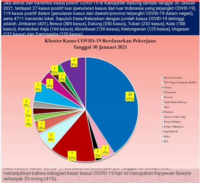 Pada Sabtu (30/1/2021), hari ini ada tambahan 49 kasus positif/konfirmasi sehingga total kumulatif kasus positif/konfirmasi covid-19 di Kabupaten Badung kini menjadi 4.857 orang. Hal ini diungkapkan Koordinator Kehumasan GTPP Covid-19 Badung GN Jaya Saputra.