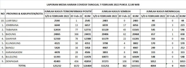 Kasus baru covid-19 di Bali pada Senin (7/2/2022) bertambah 1.172 orang, sementara kasus sembuh bertambah 302 orang. Kasus meninggal 9 orang. Data ini diperoleh dari Satgas Penanganan Covid-19 Bali melalui Humas Pemprov Bali.