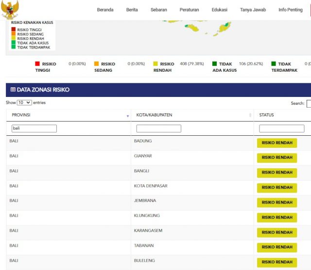 Delapan kabupaten dan satu kota di Bali masuk zone kuning dengan risiko rendah. Kesembilan kabupaten kota tersebut adalah Kabupaten Badung, Gianyar, Klungkung, Bangli, Tabanan, Kabupaten Jembrana, Karangasem, Buleleng, dan Kota Denpasar. (sar/hmbal)