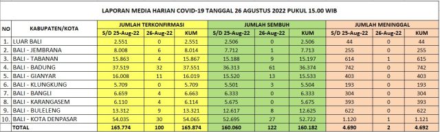 Kasus baru covid-19 di Bali pada Jumat (26/8/2022) bertambah 100 yang terdiri atas 84 warga negara Indonesia (WNI) dan 16 warga negara asing (WNA), sementara kasus sembuh bertambah 122 orang. Kasus meninggal dua orang. Data ini diperoleh dari Satgas Penanganan Covid-19 Bali melalui Humas Pemprov Bali.