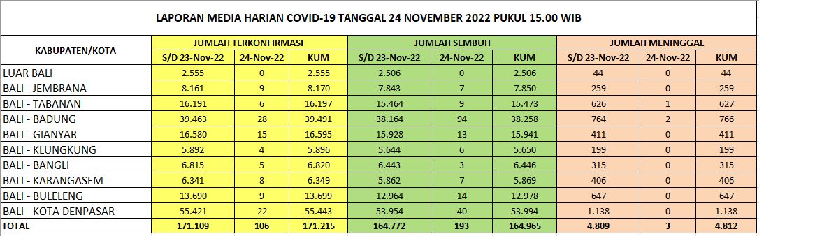 Kasus baru covid-19 di Bali pada Kamis (24/11/2022) bertambah 106, sementara kasus sembuh bertambah 193 orang. Kasus meninggal tiga orang. Data ini diperoleh dari Satgas Penanganan Covid-19 Bali melalui Humas Pemprov Bali.