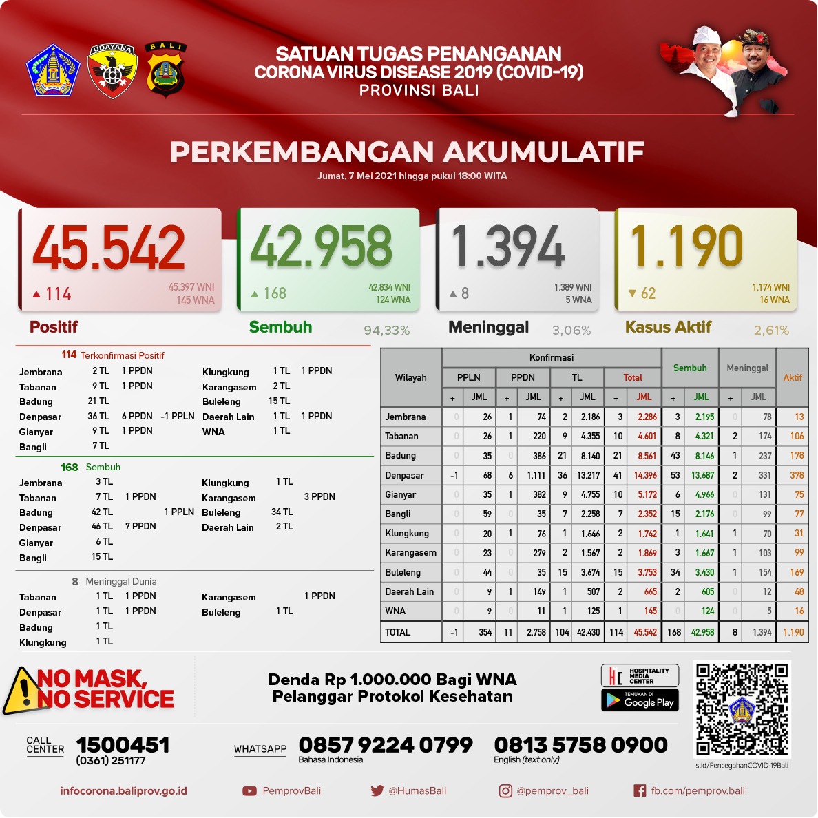 sembuh 42.958 orang (94,33%), dan meninggal dunia 1.394 orang (3,06%). Kasus aktif per hari ini menjadi 1.190 orang (2,61%).
